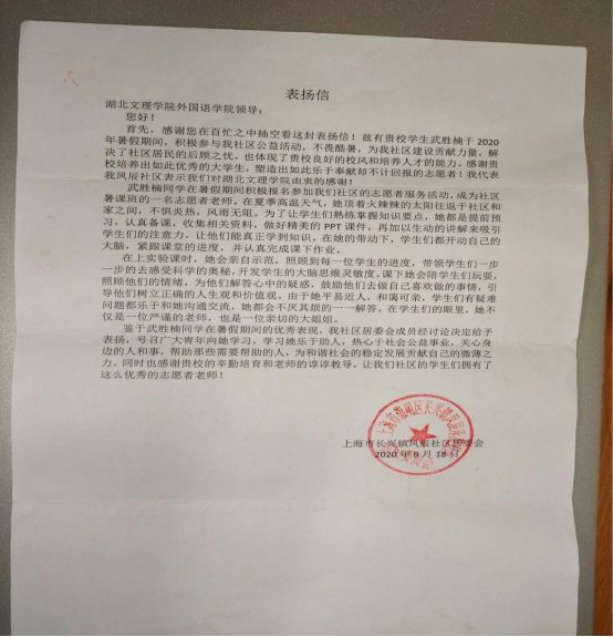(外院通讯员胡锦懿 呙小云)2020年8月18日上海市长兴镇凤辰社区居委会寄予外国语学院一封表扬信。信中高度赞扬了外院武胜楠同学于暑假期间所作出的高尚无私,乐于奉献的志愿行为。