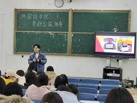 老师为大家讲述了研究生的意义以及外语专业就业前景,为我们解读了考研这两个字的含义、理清考研的动机,点明考研的学习重点,通过举例分析鼓励大家确定目标,努力学习,让更多同学认清当前的考研形势,并提出了专业性的建议。