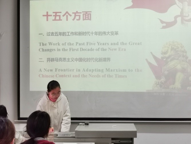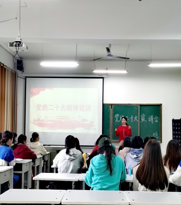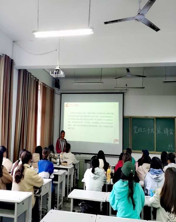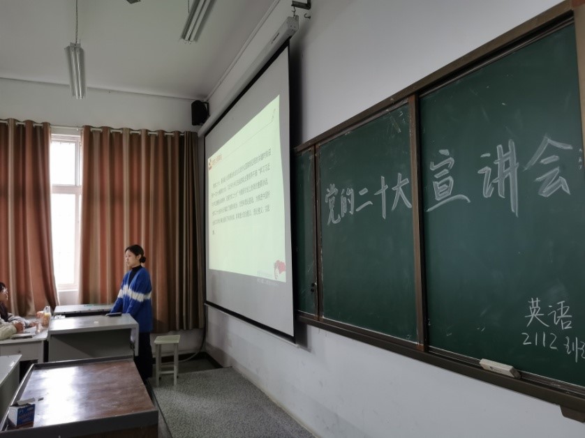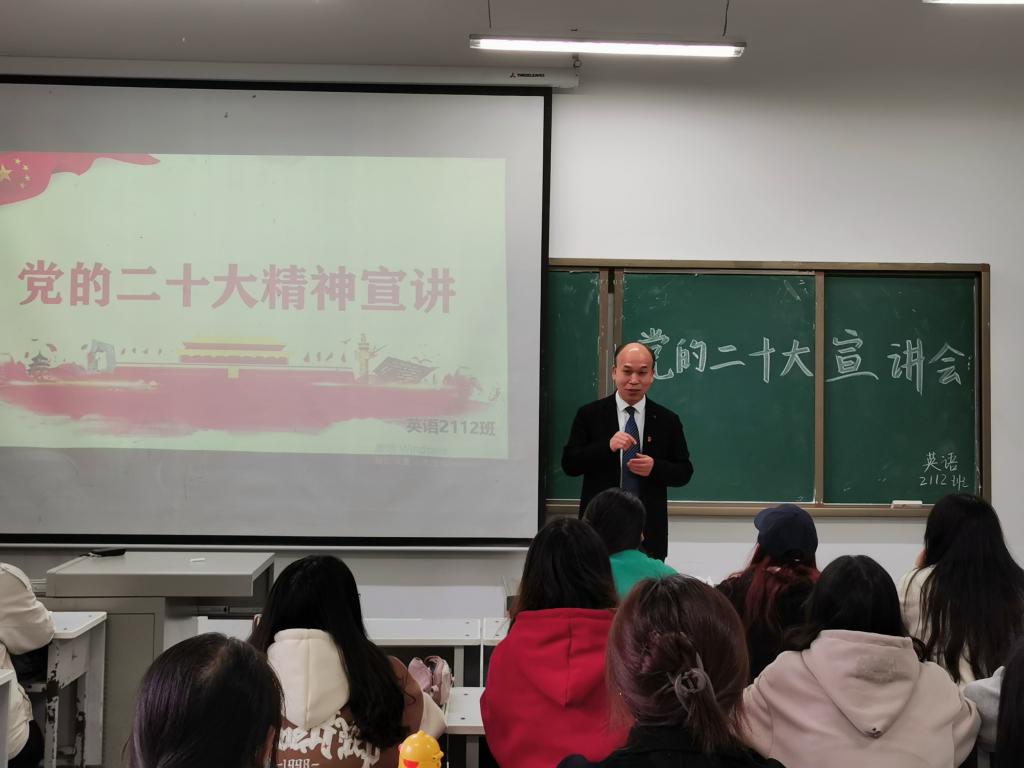 (外院教工通讯员 黄雯)10月28日中午,外国语学院英语2112班在S7-105教室召开主题班会,学习宣传贯彻党的二十大精神,分享学习体会。联系该班的外国语学院党委书记陈丰杰参加学习活动,班会由班主任黄雯老师主持。