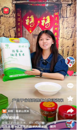 “哈喽,大家好,欢迎大家来到我的直播间。今天,给大家介绍一下我们家畅销产品,产自于谷城县的陈家山陶湾贡米......”实践团成员杨秀洁和王文志同学配合得十分默契,既能很好的根据各自的特长形成互补优势,又能互相帮助共同学习新的工具和自媒体运营技术。几天时间里,成员们通过二个账号共开展了十几场直播,直播场均点赞量非常高,浏览人数上千余人,卖出大米、香椿等农副产品,超出了预期的目标,直播活动取得了良好的效果。