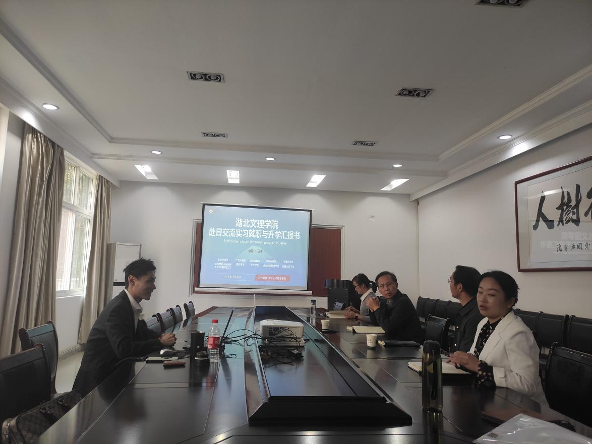 (外国语学院通讯员  张皓)10月7日-8日,为推进日语专业学生海外实习就业,北京樱桥友好国际教育有限公司邹虎老师为日语专业大三、大四学生做了海外实习宣讲,并与院系领导详细汇报了学生赴日实习的相关情况。外国语学院党委书记郑品胜、副院长袁在成、日语系主任苗占婷、支部书记李小俞等人参加。