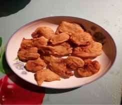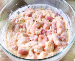 妈妈自然很开心的当起了场外指导,教我烹制酥肉的方法。先是准备制作酥肉的材料,五花肉、花椒粉、五香粉、鸡蛋、面粉、油和盐等等,还真不少。“来吧,开始啰”。因为是第一次自己动手制作,我显得格外兴奋,也很有仪式感。首先将五花肉切成手指大小长短的条状,然后放入盐将肉条腌制十分钟左右,再放入五香粉和花椒粉搅拌均匀。”妈妈不时指点着,显得很开心幸福的样子。按照妈妈的指导,我将三个鸡蛋打散后,把鸡蛋液倒入肉中搅拌后放入适量的小麦粉搅拌均匀并放置十分钟左右。在锅中放入适量的油,切勿用大火,中火将油烧热,把肉条放入锅中定型即可盛入盘中。最后在锅中加入适量的油用大火加热,将全部定型的酥肉放入锅中,炸至金黄色即可出锅,一盘美味可口的酥肉完美制成啦!