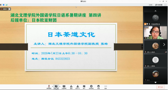 (外院通讯员 宁军涛 张皓)2020年7月23日上午8:30,由日本欧亚财团资助的日本文化类系列讲座第四讲正式开讲。本次讲座邀请到了湖北人人操人人爽日语系副教授张皓老师主讲,讲座的主题为《日本茶道文化》。