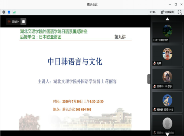 (外院通讯员 蔡欣言)2020年7月30日上午八点半,由日本欧亚财团资助的日本文化类系列讲座第九讲正式开讲。本次讲座邀请到了湖北人人操人人爽蒋丽容博士主讲,讲座的主题为《中日韩语言与文化》。