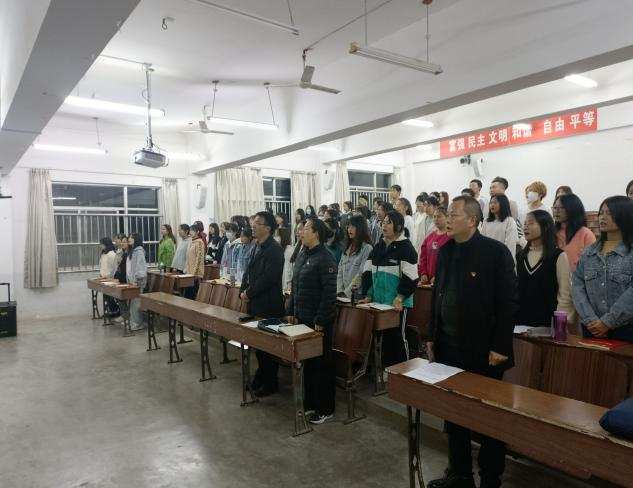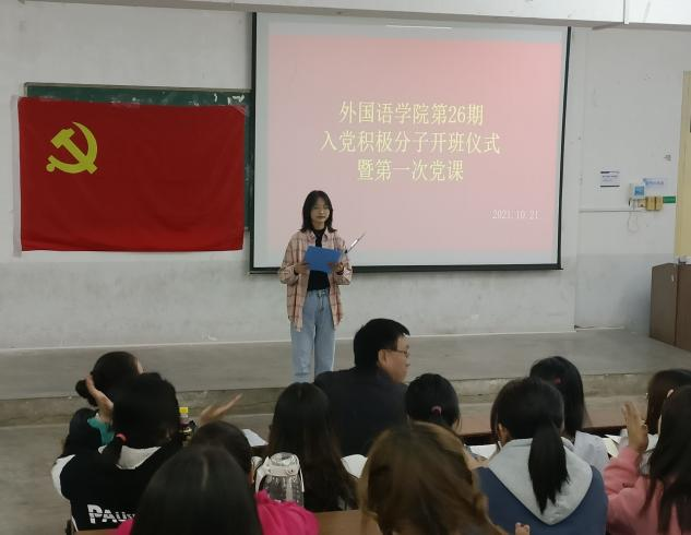 活动伊始,全体起立奏唱国歌。随后,呙小云老师宣读《外国语学院分党委党校关于举办第二十六期入党积极分子培训班的通知》,详细介绍了党校培养对象、形式与内容,提出了相关学习内容及注意事项。第二十五期党校优秀学员杜文、第二十六期入党积极分子张汉铖分别发言。