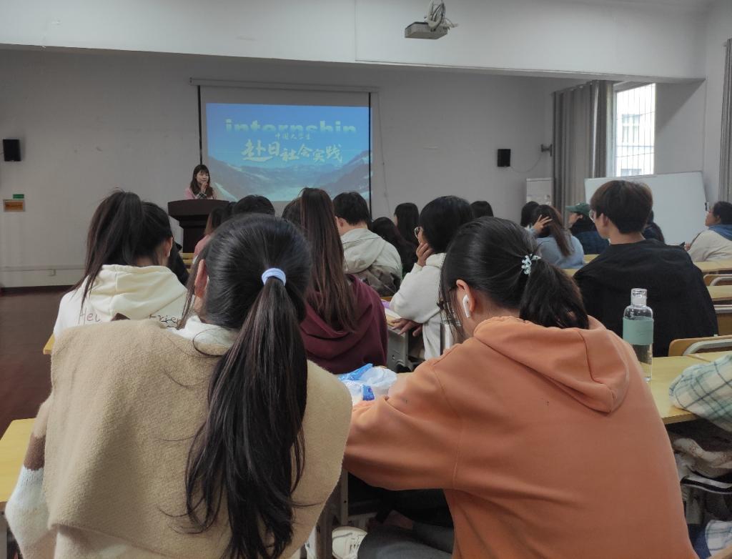 宣讲环节,党雨欣介绍了“中国大学生赴日社会实践项目”。该项目参加者以实习生身份进入日本企业,与当地同事及国际学生一起工作,开展为期三个月或六个月的职场实践活动,重点介绍了项目内容、参与流程、安全管理制度和对未来规划的益处。通过往年其他学校赴日实习学生的图片、动画展示及党雨欣的亲身经历,学生们对该项目抱有较高兴趣,纷纷提出自己关心的问题,并得到了有效解答。