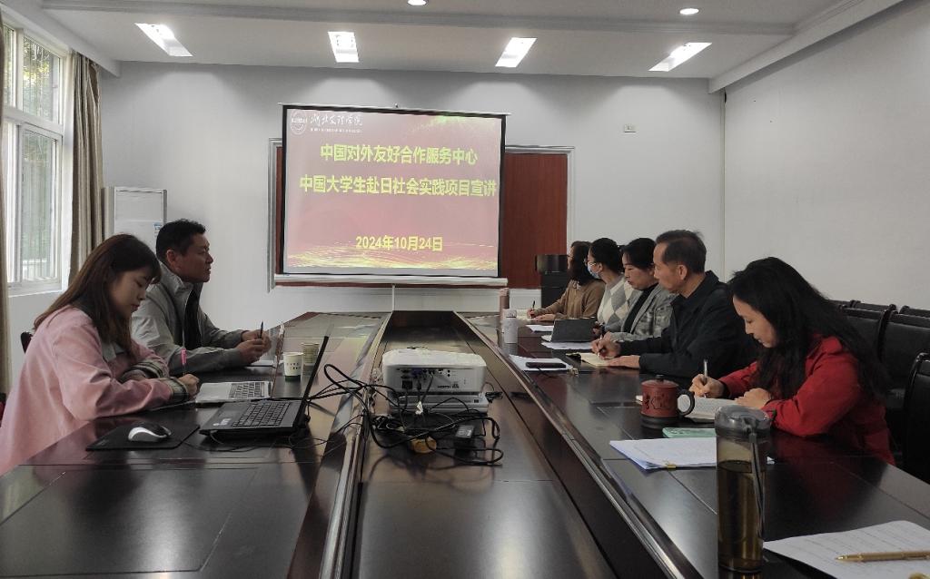 (外国语学院通讯员 苗占婷)10月24日,原中国人民对外友好协会下属单位中国对外友好合作服务中心宝虎部长和“大学生赴日社会实践”项目华南地区负责人党雨欣一行来我院进行“中国大学生赴日社会实践”项目交流和宣讲,外国语学院副院长袁在成、党委委员曹秀萍、日语系书记主任、教研室主任等参加。