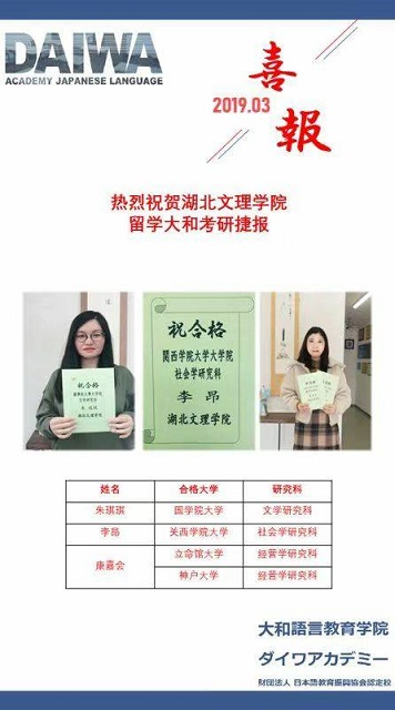 (外语学院 通讯员 苗占婷)3月20日,外国语学院日语专业负责人收到海外实践教学基地——大和语言教学学院刘彦君校长发来的考研喜报:今年有3名学生分别考上了国学院大学、关西学院大学、立命馆大学和神户大学等日本知名大学,其中康嘉会同学取得了立命馆大学和神户大学双校录取资格。