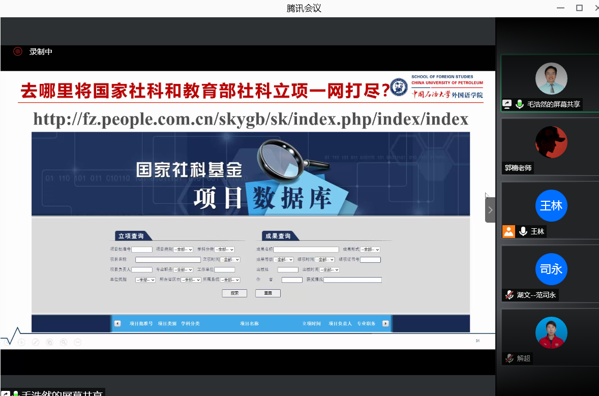 (外国语学院通讯员 王林)2021年3月22日晚,中国石油大学(华东)外国语学院院长毛浩然教授应邀作客“隆中讲坛”,通过线上为外国语学院教师作了题为“国家社科项目申报的痛与通”的学术讲座。讲座由外国语副院长王林主持,外语学院及其它学院部分教师共80余人聆听了讲座。