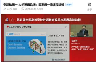 (外国语学院通讯员 黄治勇)2021年3月20日至22日,由北京外国语大学、教育部高等学校外国语言文学类专业教学指导委员会、教育部高等学校大学外语教学指导委员会主办,外语教学与研究出版社承办的第五届全国高等学校外语教育改革与发展高端论坛会议在京召开,腾讯视频同步直播。会议主题是:铸教、铸人、铸魂!这是自2016年举办首届大会以来中国高等外语教育界一年一度的盛事。为促进我校大学英语教学改革与发展,大英部组织全体任课教师在线观看,学习和了解外语教育界最新动态。