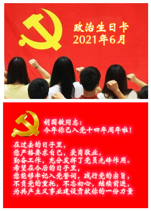 一、回顾初心:为六月入党的党员胡国敏过政治生日。