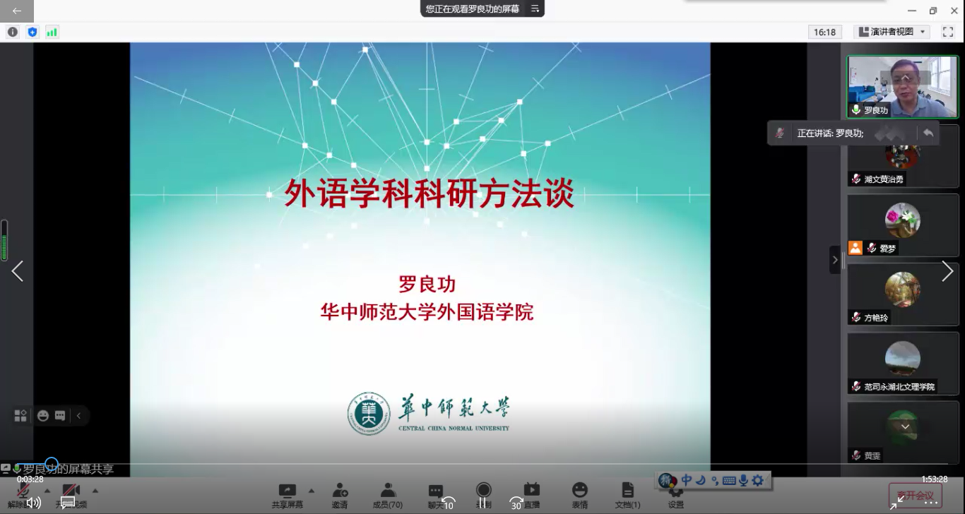 (外国语学院通讯员 王林)2021年8月18日下午,华中师范大学外国语学院院长、博士生导师罗良功教授受邀做客隆中讲坛,为外国语学院师生带来了一场题为“外语学科科研方法谈”的线上学术讲座,讲座由外国语学院副院长王林主持。首先,罗良功从“立德、立功、立言”出发说明为什么要做科研,指出科研是大学老师的应有之义。随后,以其自身的学术经历和管理经历为例,罗良功向师生们详细讲解了外语学科科研方法的动力、起点、方法和路径,教导老师们如何从个人兴趣和教学中发现教学科研研究问题,强调要具有学者意识和专家意识,应先聚焦研究方向,再进一步拓展研究领域;同时,他指出,要在研究中具有体系意识和创新意识,勤于并善于整合自己的研究,从而可以达到根茎效应,由产出论文到申请科研项目再到出版著作,使自己的科研具有连续性。