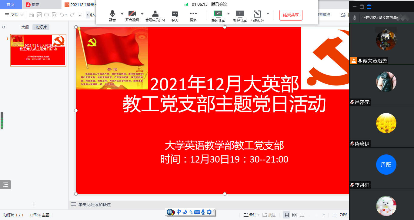 (外院通讯员李倩)2021年12月30日晚大学英语教学部教工党支部以腾讯会议形式线上开展12月支部主题党日活动,活动主题为:“学习贯彻党的十九届六中全会精神----奋力争创一流业绩”。会议由支部副书记黄治勇主持。