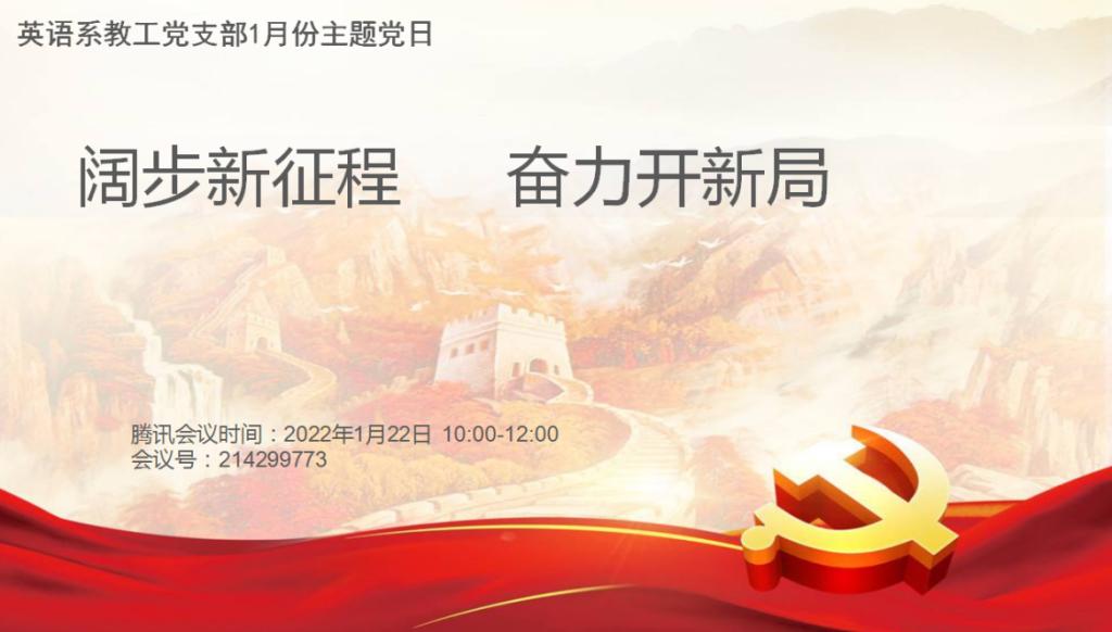 (外国语学院通讯员 郭楠)2022年1月22日上午10点,英语系教工党支部采用腾讯会议的方式开展了1月支部主题党日活动,活动主题为:“阔步新征程 奋力开新局”。会议由支部书记王瑛主持。