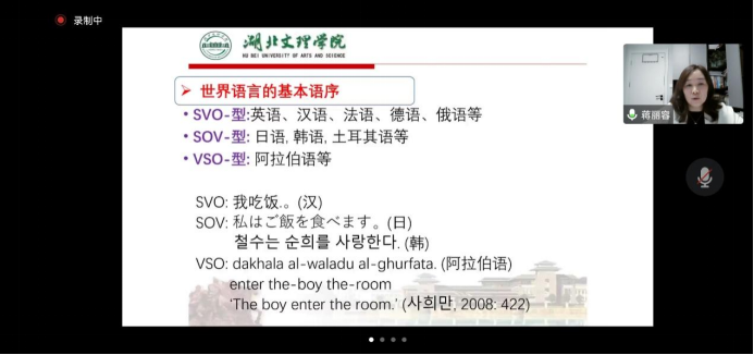 活动开始,蒋丽容老师介绍语言类型学及世界语言的类型,从类型学角度分析中日韩三国语言,让同学们对世界语言的分类及中日韩三国语言的特征有了初步的了解,然后,从中日韩接续表现的词类、形式及意义功能等方面,介绍了三国语言中接续表达之间的异同。通过讲解,我们了解到在汉语和日语语法中,接续词为独立词类,而在韩语语法中不承认接续词作为独立的词类。接着,蒋丽容老师又通过例子介绍了三国语言在标志类型、接续标志位置及意义功能分类上所呈现的特征。最后,预测分析在接续表达方面可能出现的学习问题,并为同学们在学习接续表现及外语学习方面提出了建议。