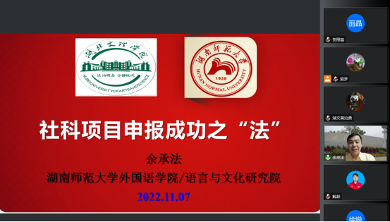 (外国语学院通讯员 贺丽晶)2022年11月7日晚,湖南师范大学外国语学院教授、博士生导师、国家社科项目及教育部项目通讯评审专家余承法应邀做客“隆中讲坛”,以《社科项目申报成功之“法”》为题,为外国语学院师生做了一场项目申报学术讲座,讲座由外国语学院副院长王林主持。
