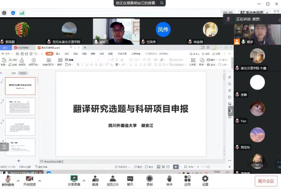 讲座中胡安江还就国家社科项目申报问题进行了指导,他详细解读了项目申报的类型、政策、申报策略和方法,指出时代是最好的出题人,提醒大家在选题中重视国家关切课题,关注社会现实问题。胡安江还讲解了项目申报书撰写中应该注意的问题,耐心解答了老师们提出的疑问。本次讲座使师生们对翻译研究前沿问题和国家社科项目申报有了更为清晰的认识,师生受益匪浅。