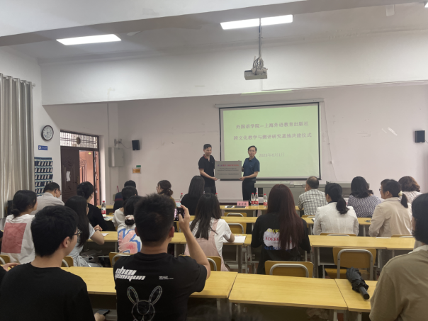 会上,上海外语教育出版社湖北中心主任沈巍向外国语学院主持行政工作副院长袁在成赠送了“跨文化教学与测评研究基地”共建匾额。出版社编辑王乐老师向与会师生宣讲了外教社WE外语智慧教育平台、“词达人”英语学习平台各项功能使用方法,重点介绍了“外教社·词达人”杯英语词汇能力大赛和跨文化能力测试与大赛等活动。