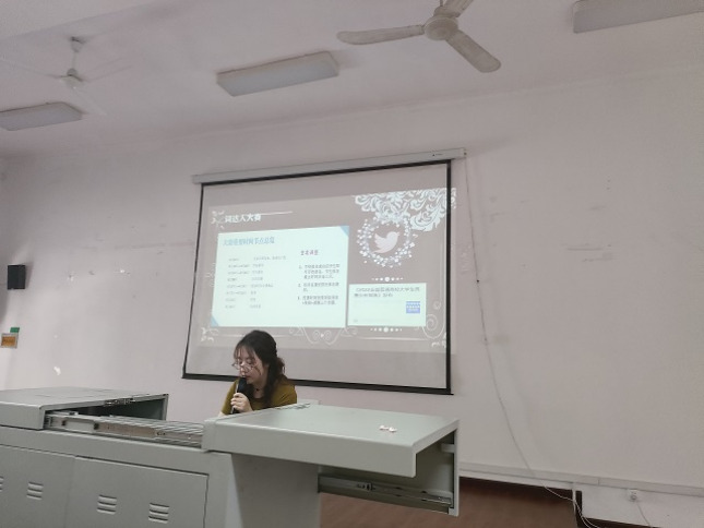 袁在成在发言中指出,我院历来重视外语学科竞赛,自“词达人”英语词汇大赛举办以来,我校学生踊跃参与,势头良好,成绩斐然。随着全国高校学生“词达人”杯英语词汇大赛和跨文化能力大赛影响力的不断提升,其获奖证书的重要性不言而喻。他要求各二级学院学习部长将本次宣讲活动的内容和精神宣传到位,号召同学们积极参与,为将来的考研、出国、就业储备硬性条件。他表示,外国语学院将为同学们参与各项外语学科竞赛提供备赛指导、培训等服务和保障,希望同学们踊跃参与,共创佳绩。