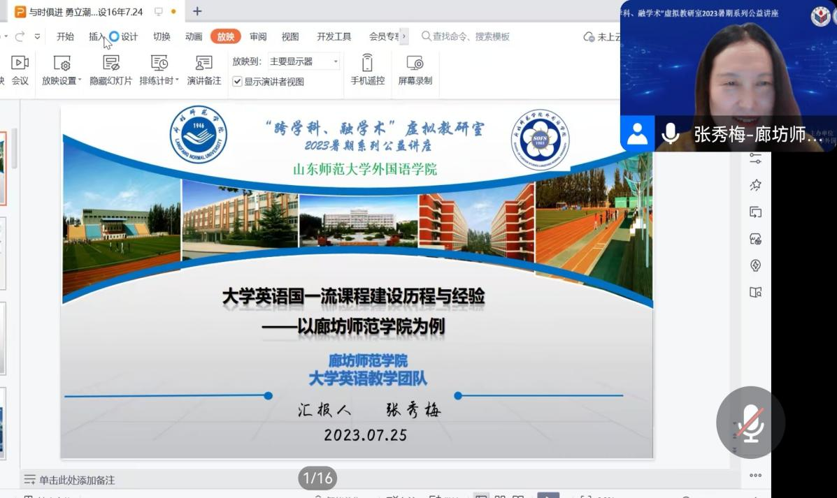 (外国语学院通讯员 王瑛)2023年7月25 日19:00-20:00,“跨学科 融学术”教研室进行了2023年第二场暑期系列公益讲座。我院作为山东师范大学外国语学院“跨学科 融学术”虚拟教研室成员,积极组织了线上学习活动。本次讲座围绕一流课程建设与申报展开,廊坊师范学院教授张秀梅、山东师范大学王卓教授分别分享了大学英语和美国文学国一流课程建设历程与经验。