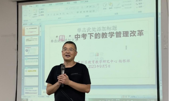 在理论层面上,杨根祥老师以“新中考下的教学管理改革为题”,从“双减”政策出发,分析了当前中学教育的发展现状及未来发展方向,从而提出了“5真”教学管理变革,即真评价、真管理、真研究、真活动、真帮扶。杨根祥强调教师应认真上课,在“实”字上下功夫。贯彻以学生为中心教育理念,不断改进课堂模式,完善教学方法,优化学习方式,关注学生课堂学习状态,提升课堂单位时间效益,全力打造生态智慧课堂。同时杨根祥还指出了校本教研的重要性,提出了 以“学校大课题+学科小课题+课堂微课题”的课题研究模型和“一课多磨+有效范式+学科共同体”的校本研修模型,提高教师的科研能力并推动校本教研的持续发展。