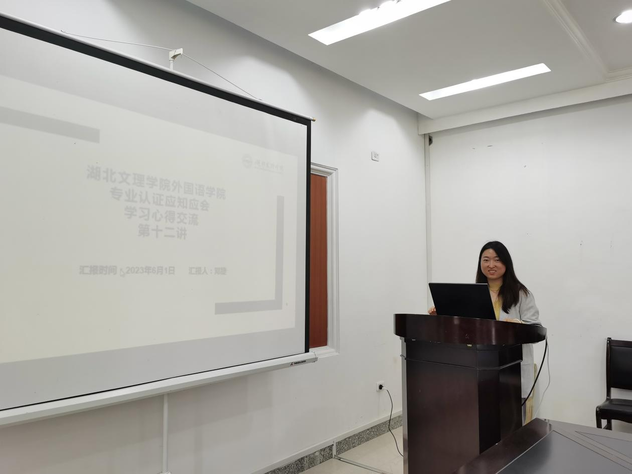 (外院通讯员 邓 捷、王 瑛)2023年6月1日,外国语学院英语师范专业认证应知应会第十二讲在一楼会议室展开,主讲人邓捷,英语系全体教师参加。