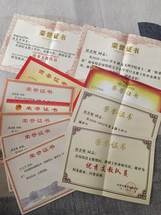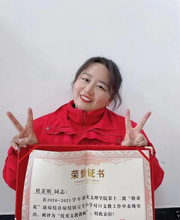 杜芷昕情系祖国边疆,深受学校“格桑花”支教团队的影响和感召。在校期间,她先后三次递交申请书,选择加入“格桑花”支教团队。正如她在申请书中写道:“在我读初中的时候,一次偶遇的机会,我了解到湖北文理学院有一支援藏支教团队,‘格桑花’是我的支教启蒙,我被‘格桑花’队员的精神所感染和鼓舞。来到湖北文理学院,我才发现我离‘格桑花’如此近。我的家庭受到过政府和社会的帮助,对此我一直怀有感恩之心,我希望将这份感恩之心传递下去,为国家和社会做点什么,让自己的青春无悔!”2021年9月,她终于被选为湖北文理学院第十二批“格桑花”援藏支教团队队员,赴西藏琼结县进行了为期半年的支教活动。