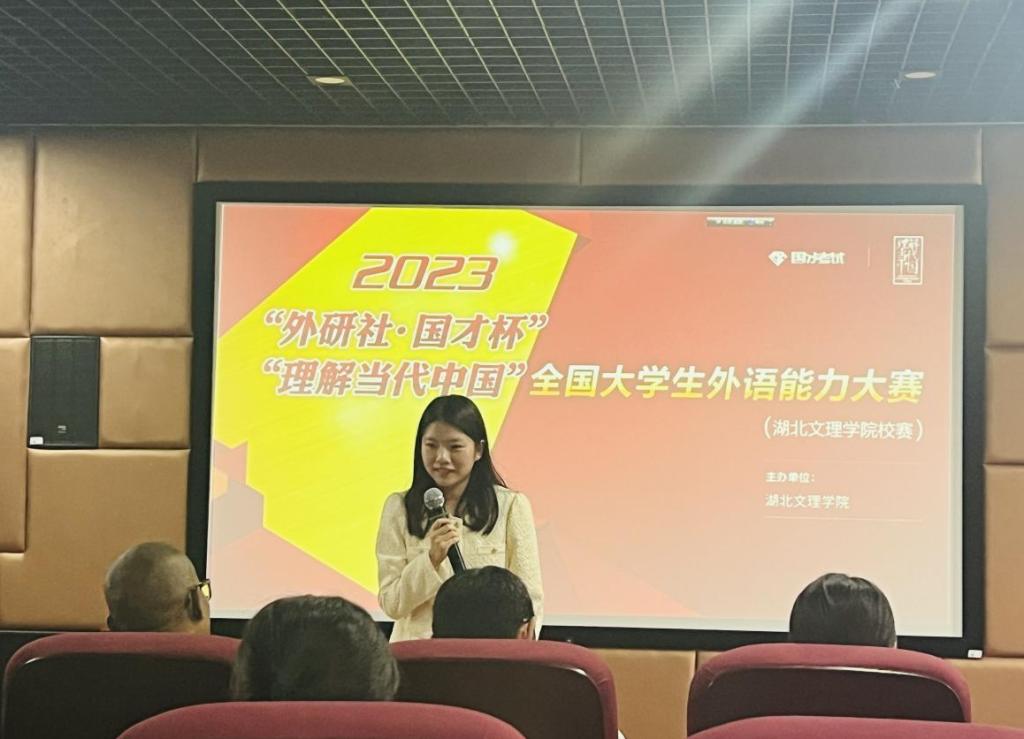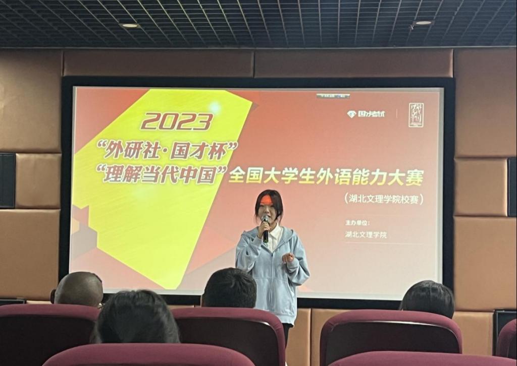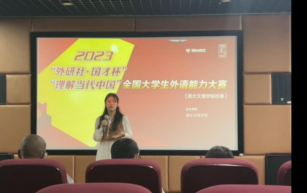 (外院教工通讯员 李丹阳)为了营造浓厚的英语学习氛围,助力同学们用英语讲好中国故事,2023年“外研社·国才杯”“理解当代中国”全国英语演讲大赛湖北文理学院赛区初赛于9月28日下午2点在N2-514多功能报告厅顺利举行。本次比赛由外语教学与研究出版社主办,我校外国语学院承办,外国语学院教师华文斌、刘婷、黄雯、邓捷及外教Thulani担任此次大赛评委,来自我校各个专业的多名选手参加比赛。