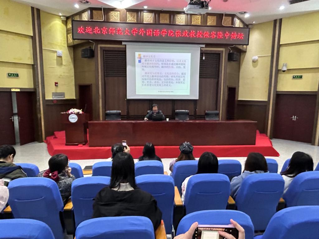 (外国语学院通讯员 贺丽晶) 为开拓师生的学术视野,提高其科研创新能力,2023年11月15日上午,外国语学院特邀北京师范大学张政教授作了题为“西化翻译与当代中国”的学术讲座。本次讲座由外国语学院副院长王林主持,来自外国语学院和文学与传媒学院的70余名教师、本科生和研究生聆听了讲座。
