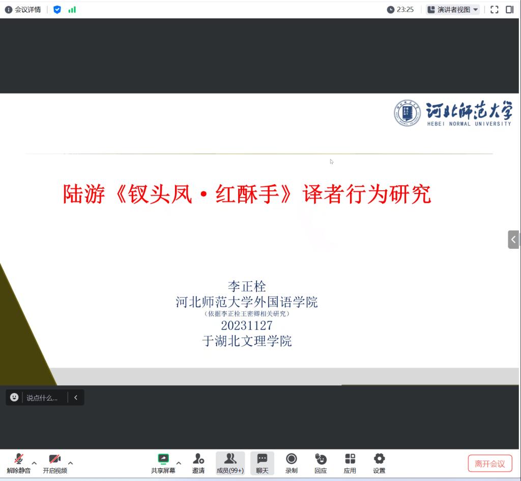 (外国语学院通讯员 贺丽晶) 2023年11月27日晚,外国语学院特邀河北师范大学李正栓教授作了题为“陆游《钗头凤▪红酥手》译者行为研究”的线上学术讲座。本次讲座由外国语学院副院长王林主持,来自湖北文理学院和全国各地的百余名师生聆听了本次讲座。