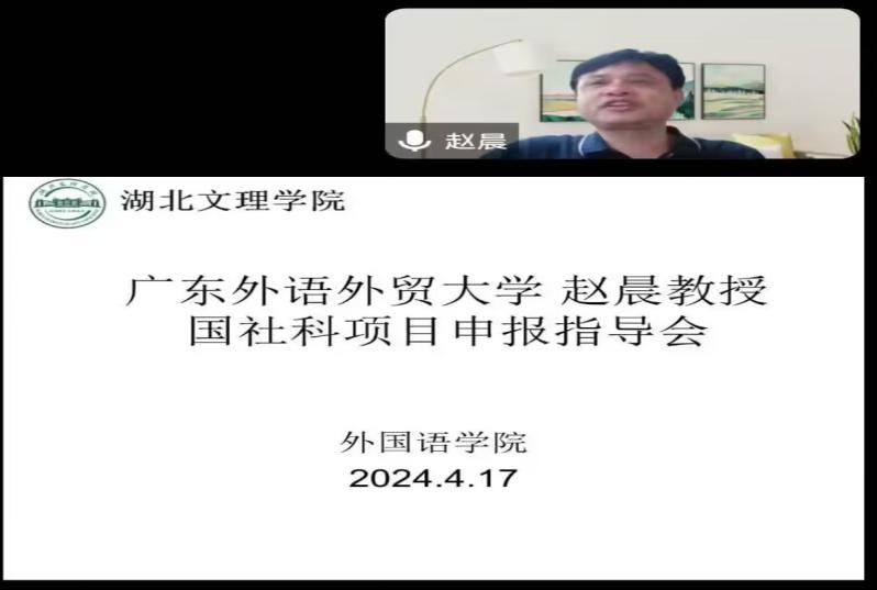 (外国语学院通讯员 贺丽晶)2024年4月17日晚,广东外语外贸大学博士生导师、“云山杰出学者”赵晨教授做客隆中讲坛,对外国语学院申报国家社科项目和教育部项目的老师进行申报指导。讲座由外国语学院副院长王林主持,外国语学院申报2024年教育部和国家社科项目的老师和部分教师参会聆听。