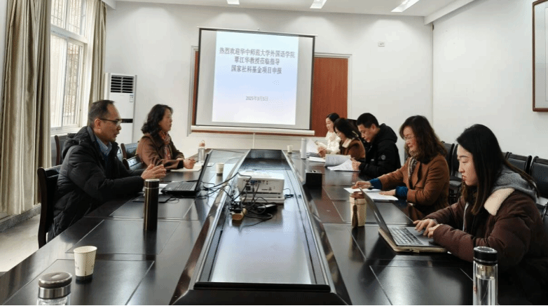 (外国语学院通讯员 贺丽晶)2025年3月5日,外国语学院特邀华中师范大学外国语学院博士生导师覃江华教授对申报2025年国家社科项目和教育部项目的老师进行指导。指导会由外国语学院副院长王林主持,主持行政工作副院长袁在成和6位申报项目的老师参加学习。